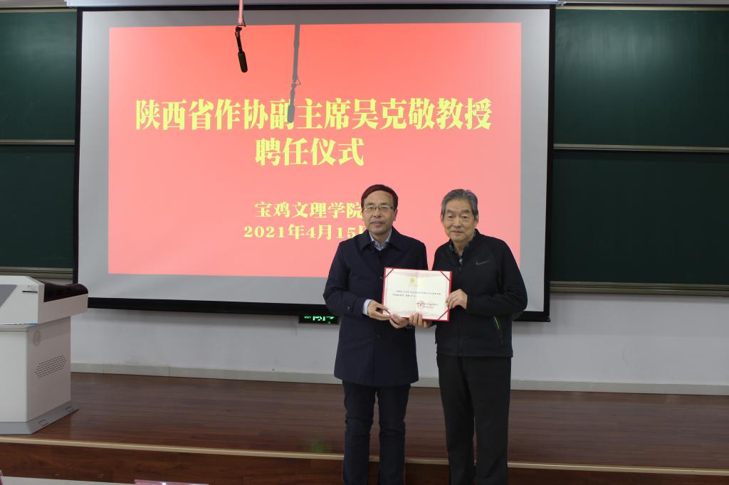 4月15日下午,陕西著名作家吴克敬教授聘任仪式在博文楼副105报告厅举行,校长郭霄鹏出席聘任仪式并为吴克敬教授颁发聘书。聘任仪式由文学与新闻传播学院院长兰拉成主持。学科建设与研究生教育管理处处长赵天绪及文传院部分领导参加了聘任仪式。
