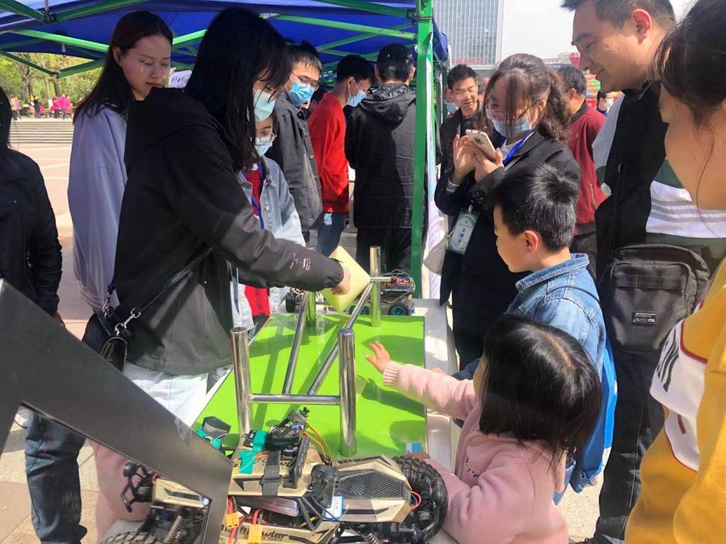 4月17日上午,“走进科学,创造未来”科普宣传活动在宝鸡市高新广场举行,活动以向广大市民展示科技作品,开展科普交流的形式为主,展示科学魅力,提高公众科学素养,活动主要展示了智能多源融合型助老杖、蓝牙小车、智能路灯、无人机、3D打印机、智能供暖除杂装置、太阳能与废气循环混合加热式沥青搅拌装置、智能隧道掘进机器人润滑装置、新型智能语音分类垃圾桶等万象城师生自主研发的科技产品。