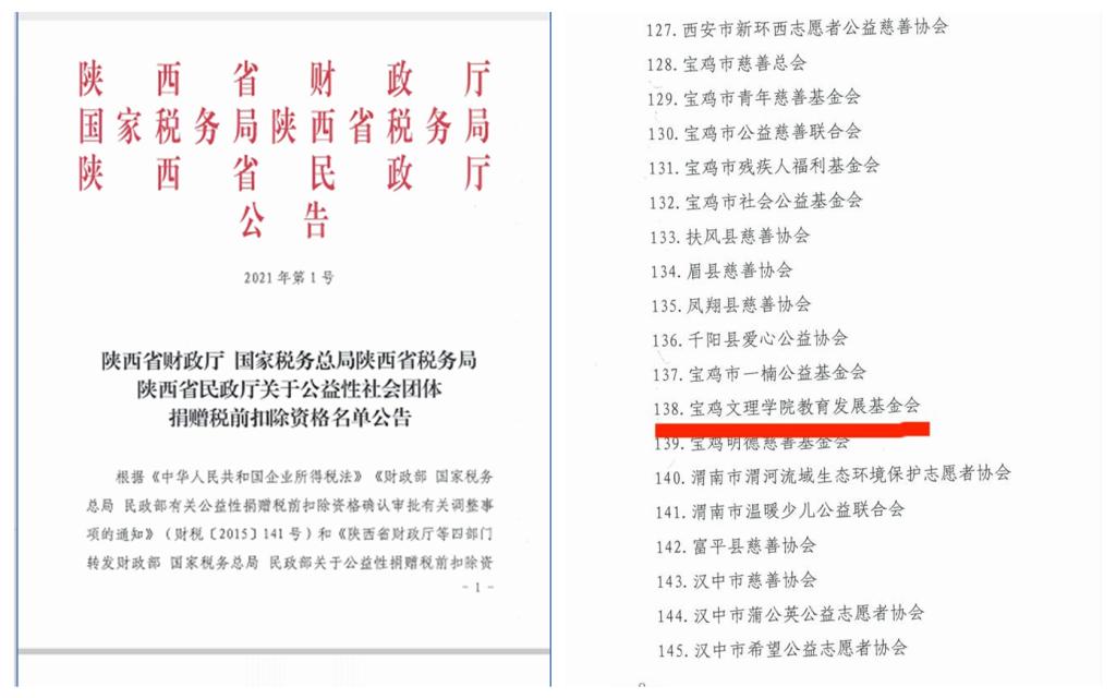 根据《陕西省财政厅、国家税务总局陕西省税务局、陕西省民政厅关于公益性社会团体捐赠税前扣除资格名单公告》,allwincity万象城官方网站教育发展基金会获得公益性社会团体捐赠税前扣除资格。获此资格,意味着向万象城教育发展基金会捐赠的企业和个人可依法享受国家税前扣除的税收优惠政策。