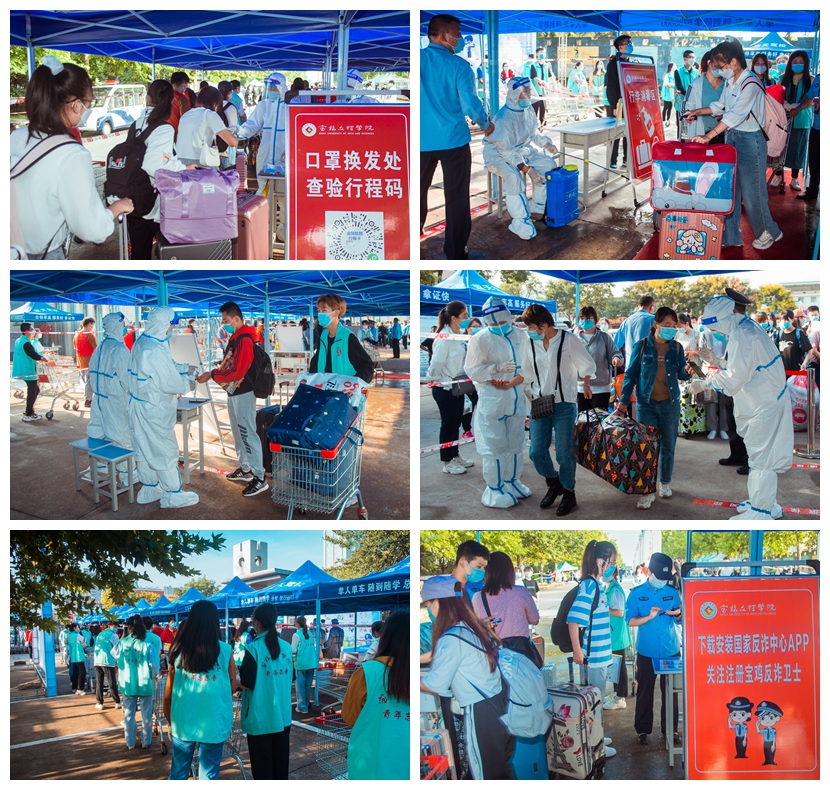 在疫情防控常态化背景下,学校统筹安排迎新期间的疫情防控工作,在校门口实行“一换二消三测四核五进”,进一步加强迎新期间的校门及新生公寓门禁管理,在寄发录取通知书时,提前告知新生家长及陪同人员不能进入校园,得到了新生家长的理解和认可。迎新期间,各部门、各学院的负责老师、同学全面到位,分工协作,积极配合,学生党员干部、志愿者和引导员随处可见。招生就业处积极协调,租用手推车、小型客运车帮助新生搬运行李,受到广大新生的欢迎;宣传部设立广播站、融媒体服务中心,让新生在入校的第一时间了解学校的新闻资讯;学生处、财务处开通绿色通道及时帮助困难新生解答资助政策,确保每一位困难新生顺利入学;保卫处制作了预防电信诈骗展板,联合高新分局开展电信反诈骗宣传;校团委、校学生会和各二级学院组建学生志愿者服务团队,穿梭在人潮中,帮助新生搬运行李,热情引导新生办理入学报到手续,帮助新生适应学校环境,尽快融入大学生活。
