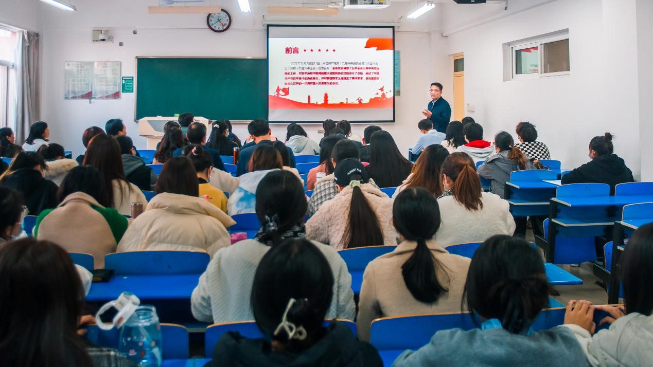 11月25日下午,校党委书记赵健在高新校区立心楼426教室以《学习六中全会精神 凝聚前进磅礴力量》为题,为外国语学院和数学与信息科学学院师生、党政办组织部联合党支部全体党员宣讲了党的十九届六中全会精神。宣讲活动由外国语学院党委书记官莉萍主持。
