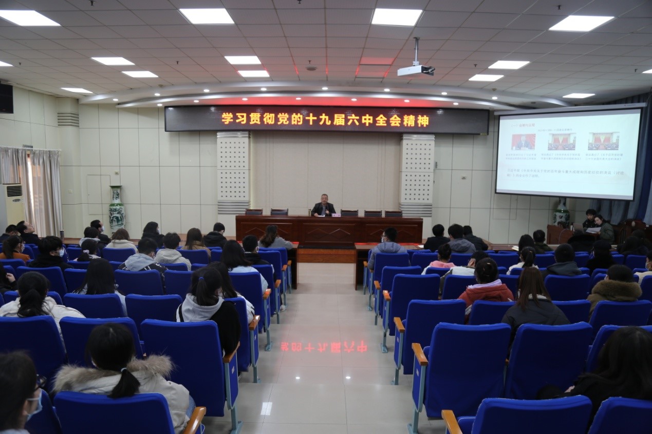 12月13日下午,校党委副书记栾宏以《坚定理想信念、牢记初心使命、为实现中华民族伟大复兴的中国梦而不懈奋斗——学习贯彻党的十九届六中全会精神》为题,在高新校区木铎厅为经济管理学院师生和学工部团委全体党员讲授专题思政课。