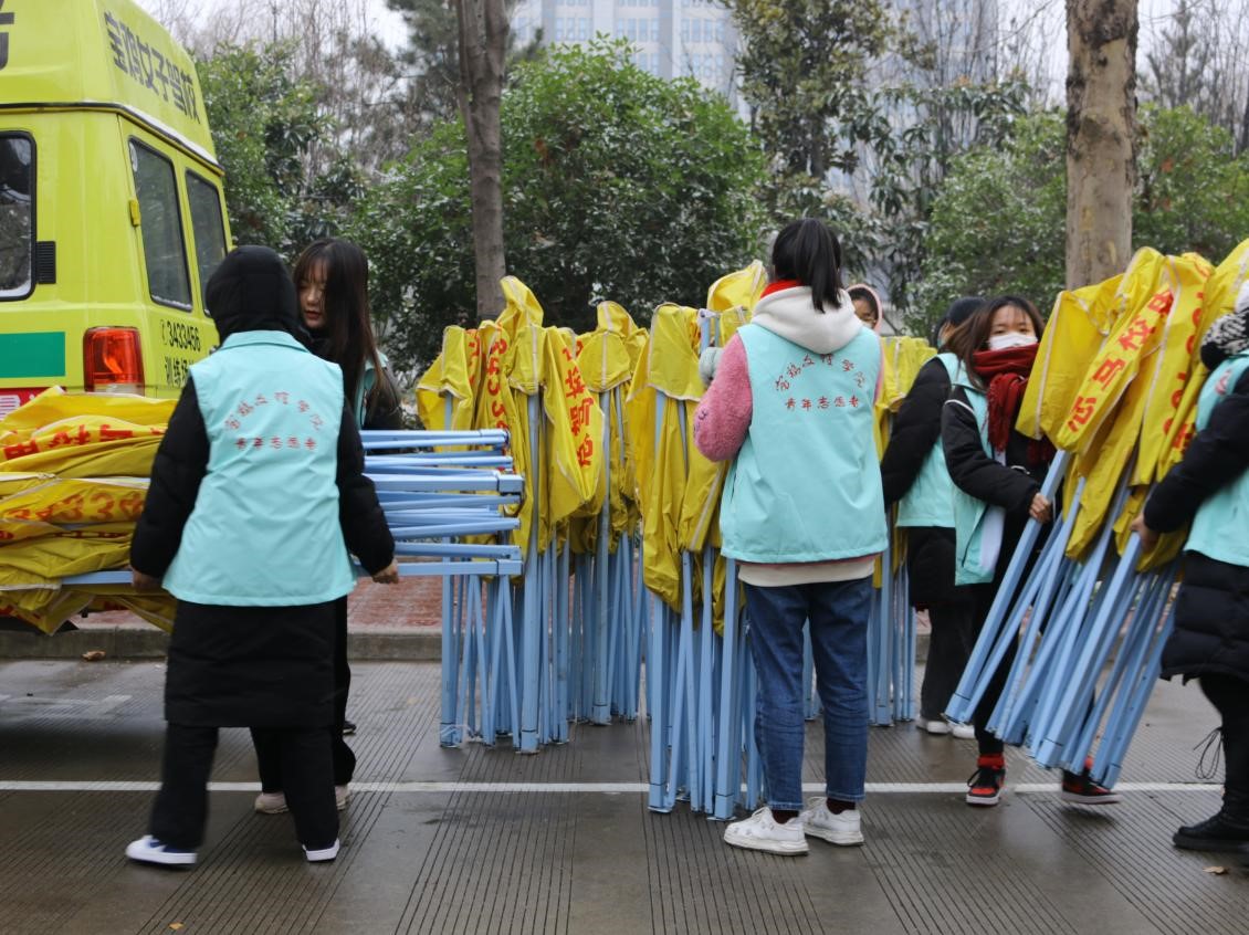12月25日、26日清晨,雪花纷飞,寒风凛冽,冬日严寒挡不住志愿者汹涌的热情。两个校区的志愿者按照岗位分工分别于6:30、7:00进入工作岗位,开始了紧张忙碌志愿服务工作。在入校检测岗位,10余个检测通道的90余名志愿者身着防护服,用心、用情守护考生、守护着我们的家园。在交通指引岗位,志愿者坚守在各个路口,志愿者耐心细致地指导考生分流到指定区域,为考生架起了爱的“指南针”。在手机收纳岗位,志愿者按照考场分好了整理盒,一张张填好姓名和手机号的便利贴贴在手机上,让考生的手机得到妥善保管,为考生提供爱心服务。在书包存放岗位,志愿者用十几顶帐篷搭起了爱心防护,几千个书包整齐的躺在铺好防水布的帐篷下,没有受到寒雪的侵扰,考生们为之感动。在考场安全检查岗位,志愿者严格工作流程,逐项检查,不留死角,搭建起了安全防线。在机动岗位,志愿者随时待命,紧急处理物资调配、转运等工作任务。在新媒体岗位,志愿者发抖的双手依然拍摄出令人感动的画面。