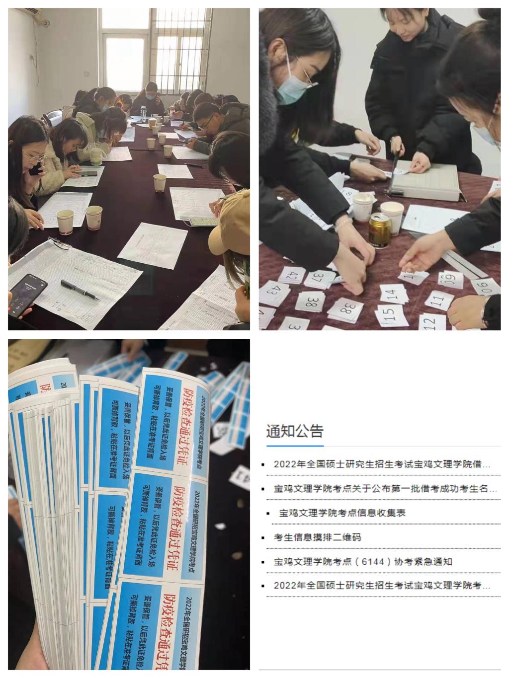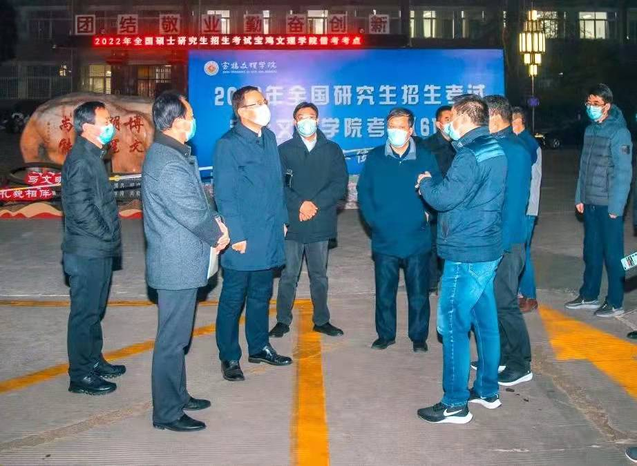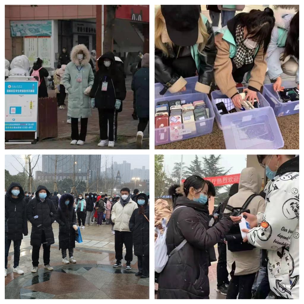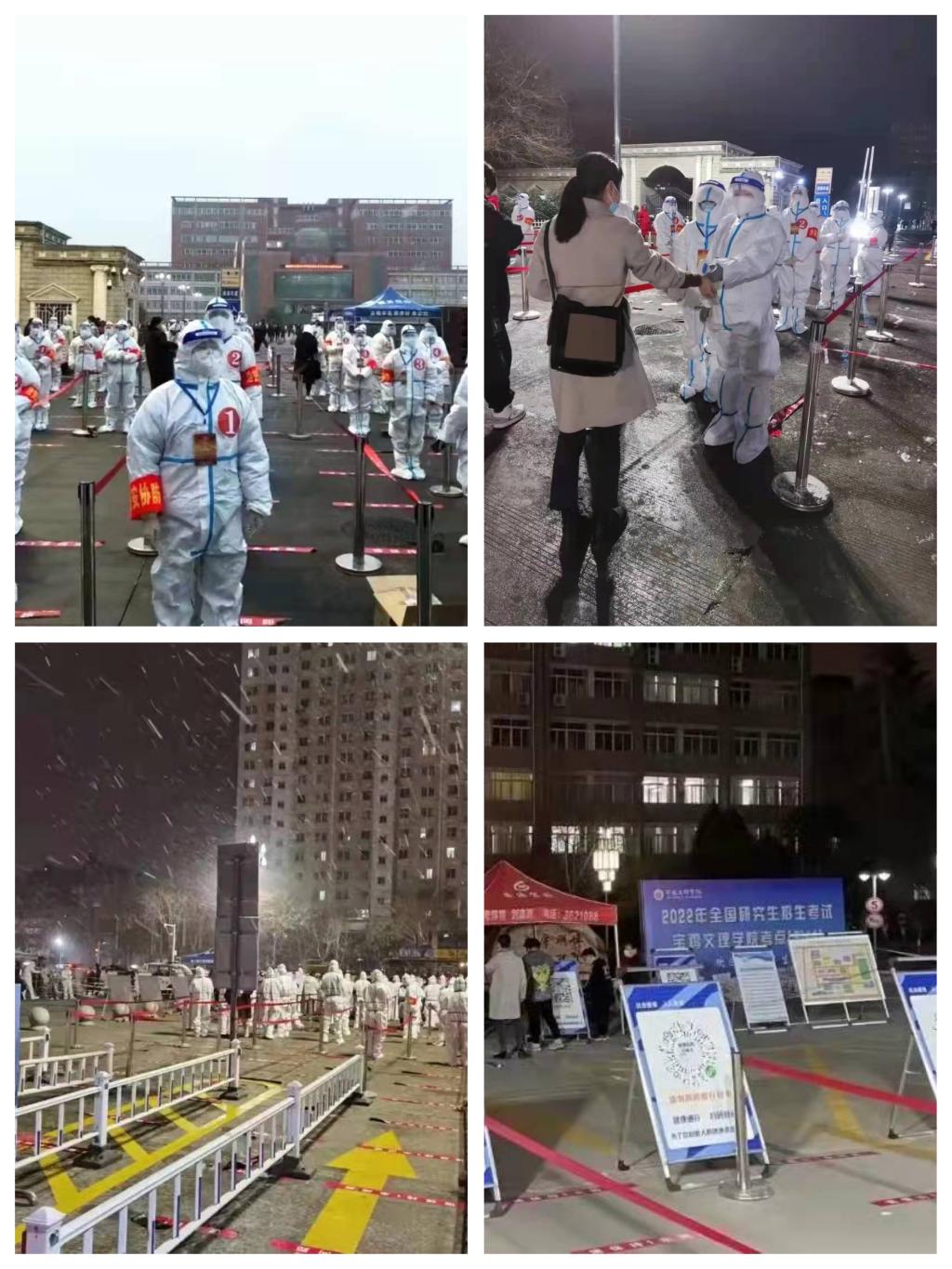 众志成城、各尽其责,为研考保驾护航。考试期间,保卫处组织近50余名工作人员和校卫队队员,在考生入口检查、保密室值守、试题押送等岗位上,恪尽职守,为师生们保驾护航。学工部、校团委组织了260名学生志愿者参与了考生一码通、核酸检测报告、行程码查验以及手机收发等工作。后勤管理处组织专人全力保障考点水、电、消杀、防疫等工作。考虑疫情影响下校外考生用餐不便,后勤集团饮食服务中心为考生及涉考教职工提供了免费午餐。党政办、纪委、宣传部、网信处等部门的工作人员,主动承担了考点巡查联络、现场监督、网络舆情监控、标准化考场监控等工作,教务处连夜为石鼓校区借考考生试题整理出保密室,学工部安排辅导员专门组织本校考生入场,研究生会志愿者承担着繁重的考务用品准备、考区布置、人脸识别、安全检查等工作,财务处、图书馆、离退处、化学化工学院、物理与光电技术学院等单位,多次支援试题整理工作,通宵达旦分拣试题,宝鸡市疫情防控指挥部、宝鸡市交警大队、宝鸡市公安局、宝鸡市无线电委员会等相关部门的工作人员,不惧严寒与风雪,冲在研招考试工作的第一线,以自己坚韧的身躯为研招考试保驾护航。