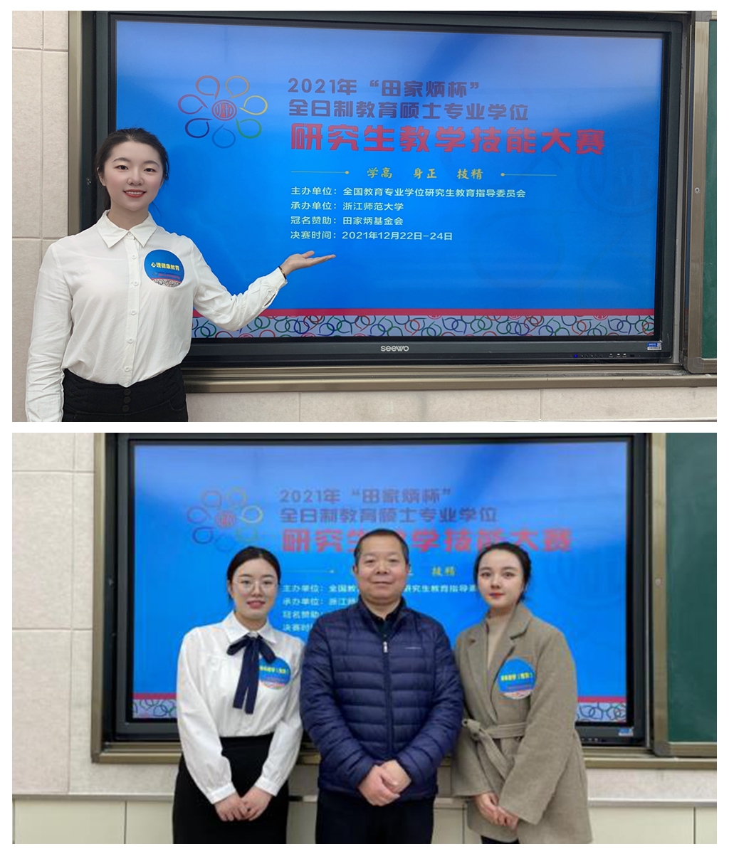 近日,由全国教育专业学位研究生教学指导委员会主办的2021年“田家炳杯”全日制教育硕士专业学位研究生教学技能大赛成功举办。在万象城教育学院院长马多秀、副院长胡少明、教授罗增让和政法学院院长张波、副院长杨福荣的带领下,教育学院2020级心理健康教育专业王颖同学和政法学院2020级学科教学(思政)专业王姝懿、张蕊等3名同学从初赛中脱颖而出入围了决赛,并在此次决赛中荣获“田家炳杯”全日制教育硕士专业学位研究生教学技能大赛三等奖。