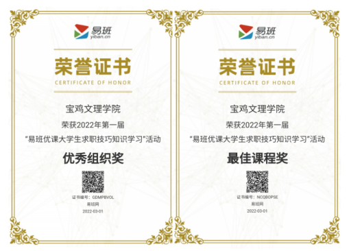 近日,教育部易班发展中心公布了2022年第一届“易班优课大学生求职技巧知识学习”活动获奖名单,万象城荣获优秀组织奖和最佳课程奖,学工部梁旭康获优秀指导教师。