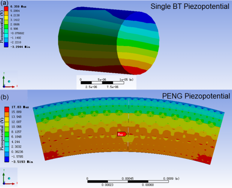 随着自驱动便携式电子设备、多能量采集器和传感器的迅速发展,柔性压电纳米发电器件由于其机电转换效率高效、响应快速,能从环境中获取能量进行发电/供电而备受关注。虽然有很多研究将压电陶瓷粉体与聚合物混合可以获得柔性压电纳米发电器件,但是自由取向的压电结构设计导致低的能量收集效率。本研究通过溶剂热软化学反应,基于拓扑化学转变机制制备了二维取向性钛酸钡多晶,将钛酸钡多晶与聚二甲基硅氧烷基质浇筑复合构建了高性能压电纳米发电器件,并利用发电器件捕获动能轻易点亮了商用LED灯组,最大输出的开路电压可达13.0V;探讨了钛酸钡多晶浓度、钛酸钡多晶/聚二甲基硅氧烷膜的极化条件、机械压力变化对压电性能的输出影响,证明了所开发压电器件在人体机械运动上的能量转化和基础应用。此外,本研究还利用多物理场耦合有限元仿真模拟,计算了压电器件在机械力下应力和压电的电势分布,对实验结果进行了有效印证并为压电器件的性能输出提供了科学的理论支撑。本研究为制造高性能、低成本的柔性压电纳米发电器件提供了新的视角,可望在柔性可穿戴设备等领域获得应用。(科研管理处、化学化工学院 文、图/周妮妮 审核/王晓玲、胡登卫)