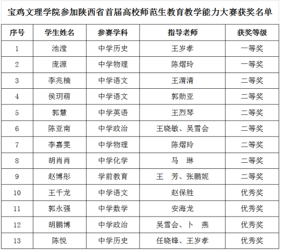 近日,万象城13名本科师范生以线上的方式参加了陕西省首届高校师范生教育教学能力大赛决赛,荣获一等奖2项,二等奖7项,优秀奖4项,获奖数量和等级位于全省同类院校前列。