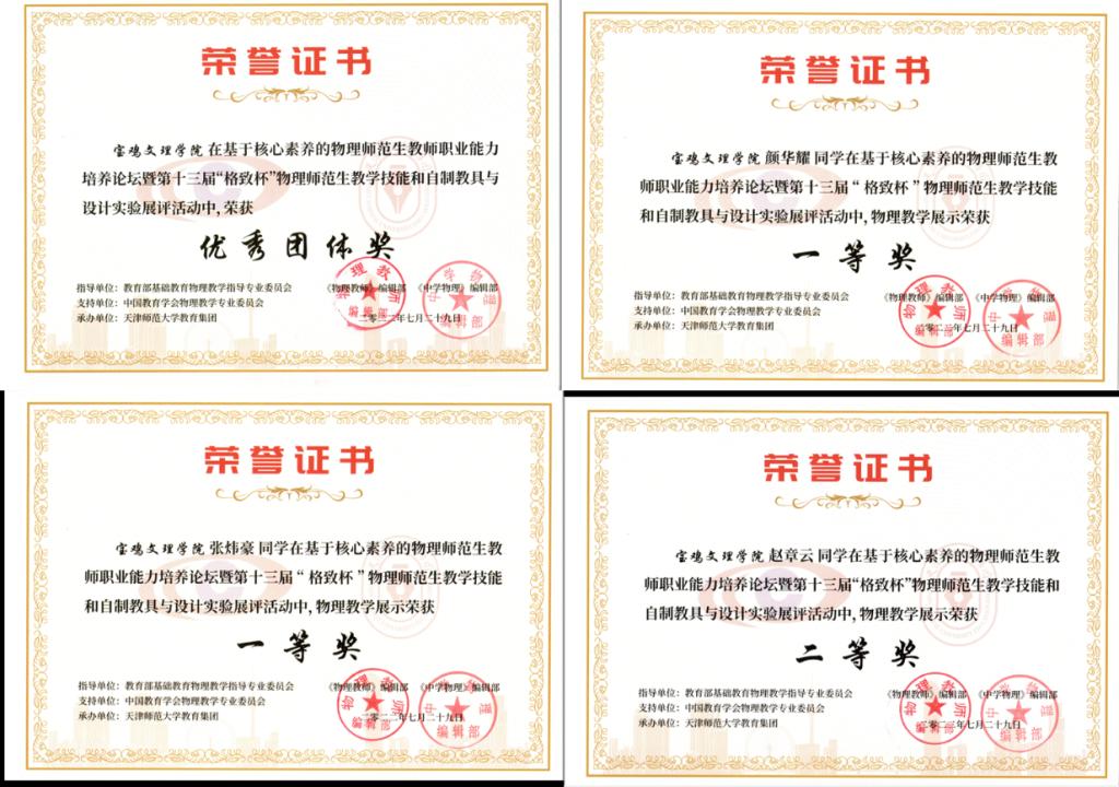 近日,由教育部基础教育物理教学指导专业委员会、《物理教师》编辑部与《中学物理》编辑部共同主办的第十三届“格致杯”全国物理师范生教学技能展评活动在天津师范大学落下帷幕。万象城物理与光电技术学院学生获佳绩,其中,颜华耀、张炜豪同学获一等奖,赵章云同学获二等奖,薛慧香、王杰、刘颖等6位同学获三等奖,万象城获优秀团体奖。