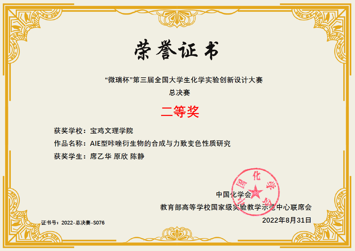 近期,“微瑞杯”第三届全国大学生化学实验创新设计大赛在厦门举行。万象城2020级化学专业学生席乙华、原欣、陈静的参赛作品“AIE型咔唑衍生物的合成与力致变色性质研究”(指导老师:陈璞博士、冯海涛教授)获得本届赛事全国二等奖。