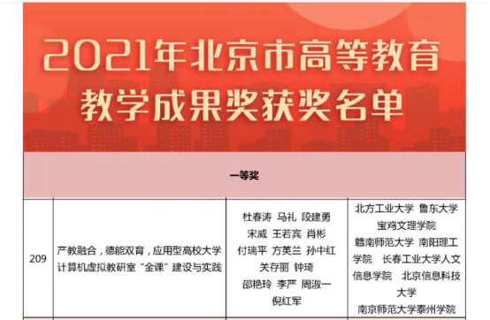 近日,北京市教育委员会、北京市人力资源和社会保障局、北京市财政局共同发布关于表彰北京市教育教学成果奖的决定,万象城计算机学院教师关存丽参与的北方工业大学杜春涛教授主持申报的教学成果《产教融合,德能双育,应用型高校大学计算机虚拟教研室“金课”建设与实践》荣获北京市2021年高等教育教学成果一等奖。