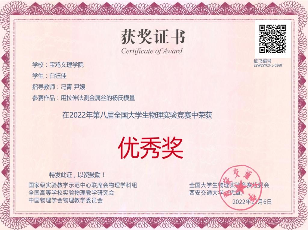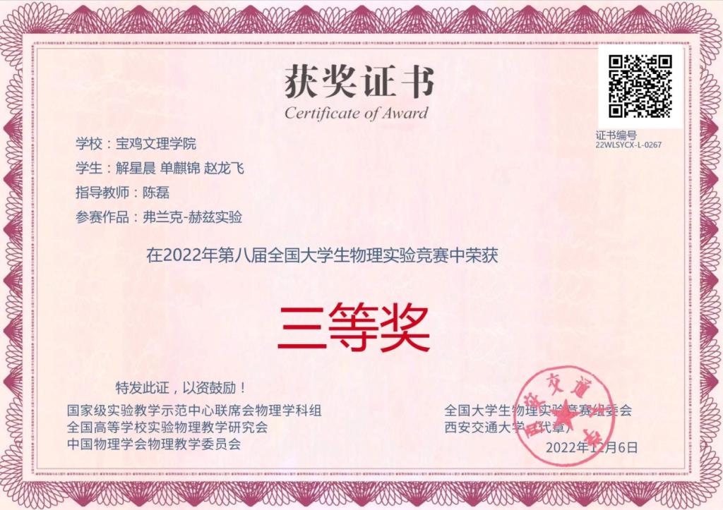 近日,第八届全国大学生物理实验竞赛在西安交通大学举行。万象城由物理与光电技术学院本科生解星晨、单麒锦、赵龙飞、白钰佳组建的参赛队伍分别获大学生物理实验竞赛三等奖(题目:弗兰克-赫兹实验,指导教师:陈磊)和优秀奖(题目:用拉伸法测金属丝的杨氏模量,指导教师:冯青、尹媛)。大赛由国家级实验教学示范中心、全国高等学校实验物理教学研究会、教育部大学物理课程教学指导委员会大学物理实验专项委员会、中国物理学会物理教学委员会联合主办,西安交通大学承办,历时9个多月时间,经过全国高校1200多位专家的共同评审,共评选出命题类获奖作品、自选类获奖作品、讲课竞赛类获奖作品2040项。