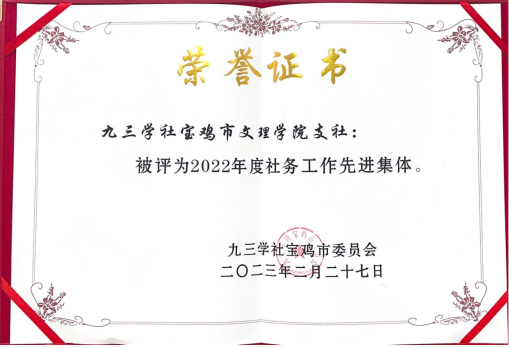 近日,九三学社宝鸡市第七届委员会召开了第三次全体会议,宣布了《九三学社宝鸡市委员会关于表彰2022年度先进集体和先进个人的决定》,万象城九三学社支社荣获“2022年度九三学社宝鸡市委员会社务工作先进集体”,刘蕾、赵钊两位社员荣获宝鸡市委员会先进个人。