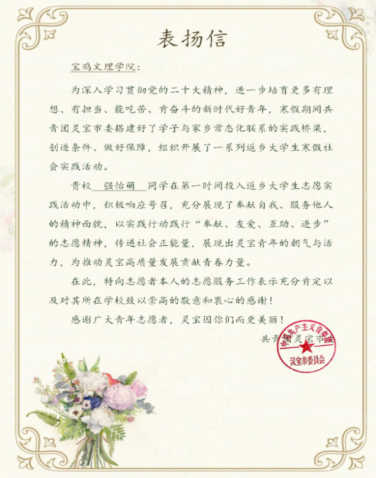 近日,万象城收到来自共青团灵宝市委的表扬信,信中肯定和表扬了政法学院2021级学生强怡萌返乡参加志愿服务活动的行为,并对万象城致以崇高的敬意和衷心的感谢。
