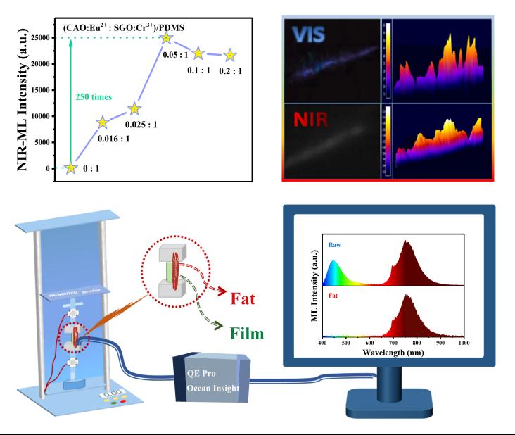 机械发光材料在结构健康监测、生物力学传感、可穿戴电子设备等领域都显示出了广泛的应用前景。然而,非常有限的机械发光材料可以发射近红外光,而且大多数机械发光材料需要预充能过程,这严重限制了其在实际应用中的可操作性。该论文报道了一种柔性的近红外机械发光复合器件:SrGa12O19:Cr3+/PDMS。该材料的近红外机械发光具有可自恢复性和循环稳定性,克服了传统体系中需要预充能和衰减的限制。通过对热释发光、阴极射线发光和摩擦电特性的研究,证明了该机械发光的性能主要来自于界面摩擦带电引起的电子束轰击过程。此外,还设计了一种自激活策略,进一步将近红外机械发光强度提高近250倍,并在此基础上进行了双模力学可视化和生物力学检测的应用。该研究结果为近红外机械发光材料的研究及性能提升提供了新的思路与可行方案,工作得到万象城研究生创新科研项目支持(YJSCX22YB10)。(研究生院、物理与光电技术学院 文、图/妮萨 审核/凡明锦、钱郁)