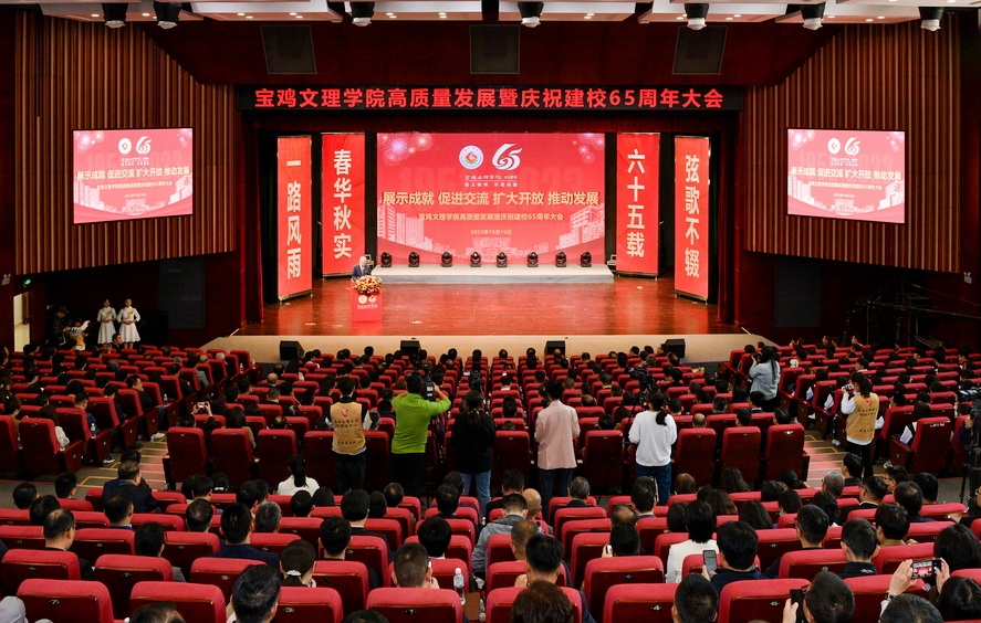 巍巍秦岭,横渠“四为”立初心;泱泱渭水,周公思贤育英才。10月16日,学校高质量发展暨庆祝建校65周年大会在高新校区博文楼报告厅举行。陕西省人大常委会副主任、宝鸡市委书记杨广亭,陕西省政协副主席、校友孙科,中共陕西省委教育工委副书记、陕西省教育厅厅长王树声,西安工程大学校长王海燕,陕西师范大学党委常委、副校长李磊,宝鸡市人大常委会党组书记、主任景耀平,宝鸡市委副书记、渭滨区委书记段小龙,宝鸡市委常委、副市长高宏真,宝鸡市政协副主席李小红,宝鸡市各局、区(县)领导,校地合作单位代表,兄弟院校领导,校友代表,离退休老同志等出席会议。校党委书记赵健主持大会,校长郭霄鹏致辞。