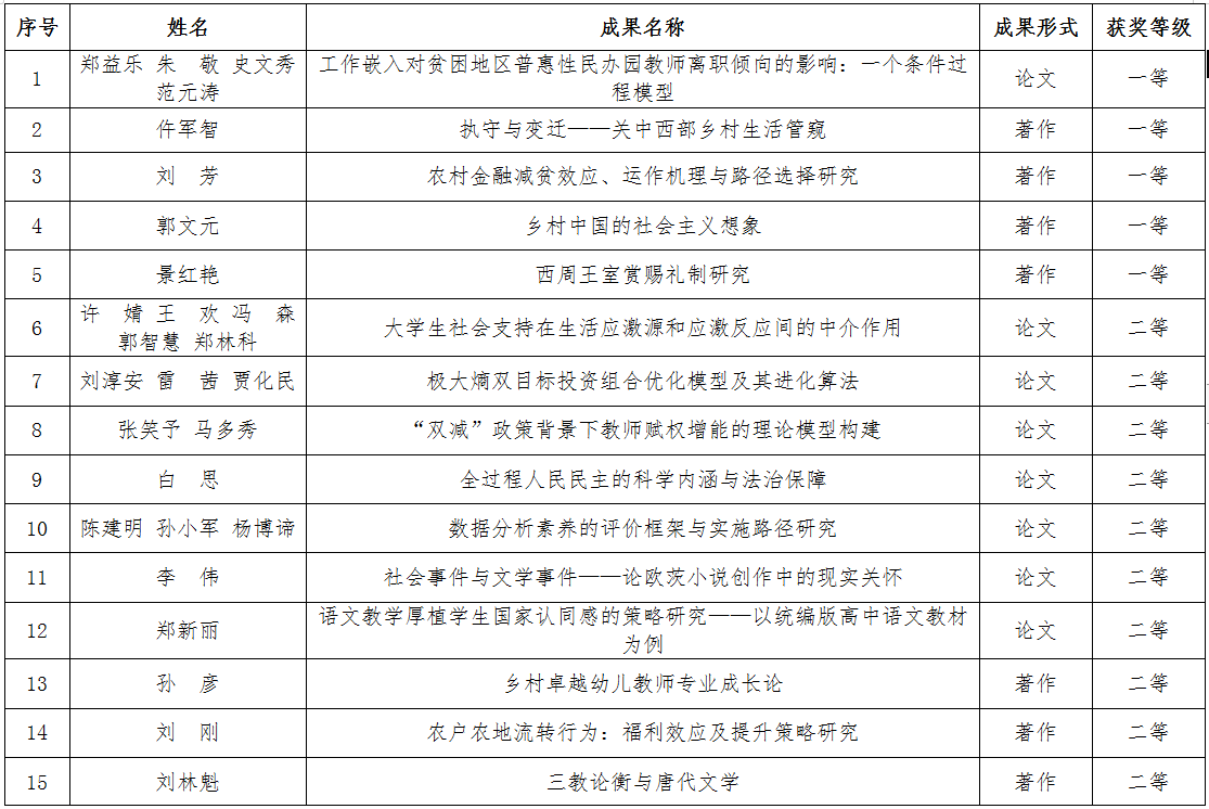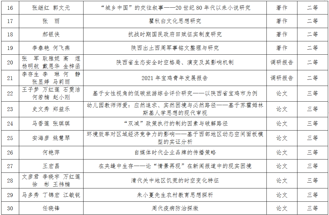 近日,宝鸡市人民政府公布了宝鸡市第十七次哲学社会科学优秀成果奖获奖名单,万象城获奖44项,其中,一等奖5项(论文1项、著作4项),二等奖16项(论文7项、著作7项、调研报告2项),三等奖23项(论文15项、著作4项、调研报告4项)。(科研管理处 文/周瑜 审核/王晓玲)