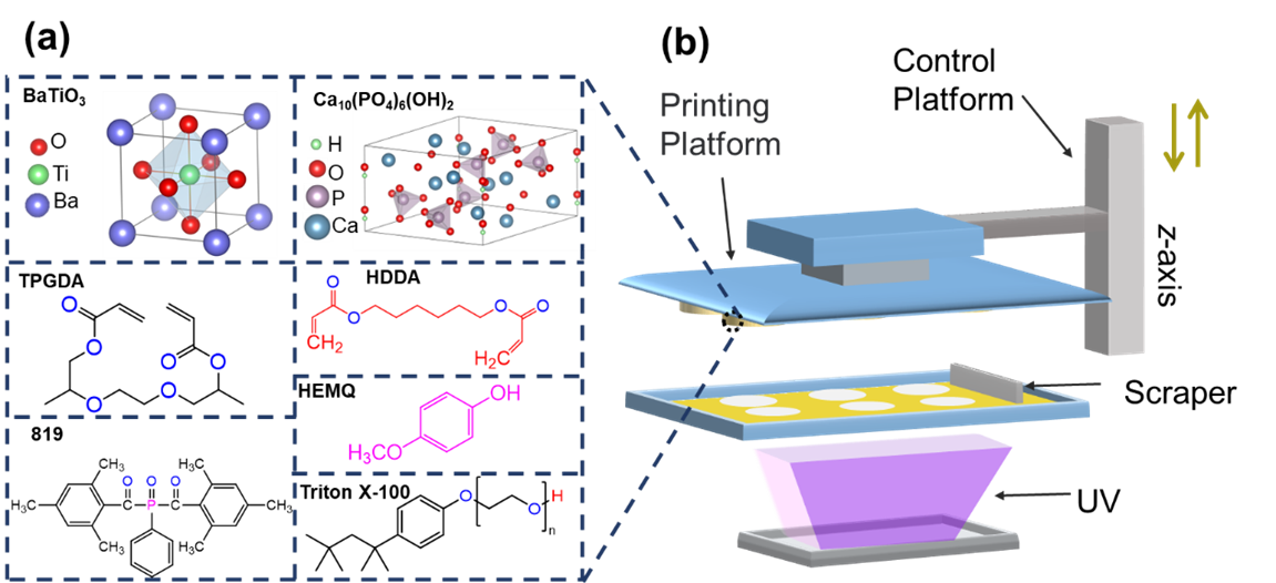 钛酸钡(BaTiO3,BT)/羟基磷灰石((Ca10(PO4)6(OH)2,HA)生物压电纳米复合材料在骨修复方面显示出巨大潜力。数字光处理(DLP)3D打印技术由于具有表面质量高、成型速度快、成型精度高等特点成为个性化制备BT/HA生物压电纳米复合材料的有效方法。但BT陶瓷的折射率与光敏单体相差较大,致使固化能力和可印刷能力降低,为DLP 3D打印制备BT/HA压电纳米复合陶瓷带来挑战。该论文首先针对DLP 3D打印开发出了低折射率BT晶体。再采用DLP3D打印技术制备了BT/HA复合陶瓷骨支架。探究了该纳米复合陶瓷在骨组织中的生物和电性能,证明了3D打印BT/HA复合陶瓷具有良好的生物性能,表征了复合陶瓷介电常数和复合陶瓷稳定的开路电压和短路电流,同时采用多物理场耦合有限元分析对低折射率BT的势能和应力分布进行了研究。发现该复合陶瓷骨支架具有高的介电性能、优异的力敏传感性和生物相容性,可缩短骨再生时间。这些功能特性的特殊组合可能使3D打印BT/HA压电复合材料成为新一代骨科植入物。