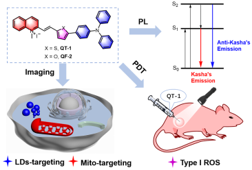 该工作设计合成了两种具有D-π-A结构的双发射聚集诱导发光分子QT-1和QF-2(AIEgens),这两种AIEgens均表现出激发波长依赖性的反卡莎性质,并能实现脂滴(蓝色)和线粒体(红色)的双色成像。此外,由于QT-1的近红外发射和丰富的ROS产生效率,QT-1被筛选为光动力治疗的光敏剂,在体外和体内均表现出优异的抗肿瘤效果。