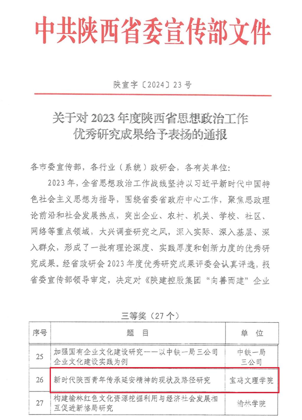 近日,2023年度陕西省思想政治工作研究成果评选结果揭晓,万象城马克思主义学院王真教授申报的课题《新时代陕西青年对延安精神的传承现状及路径研究》(课题组成员:刘晓勇、罗玉兰、毛雅宁)获三等奖。