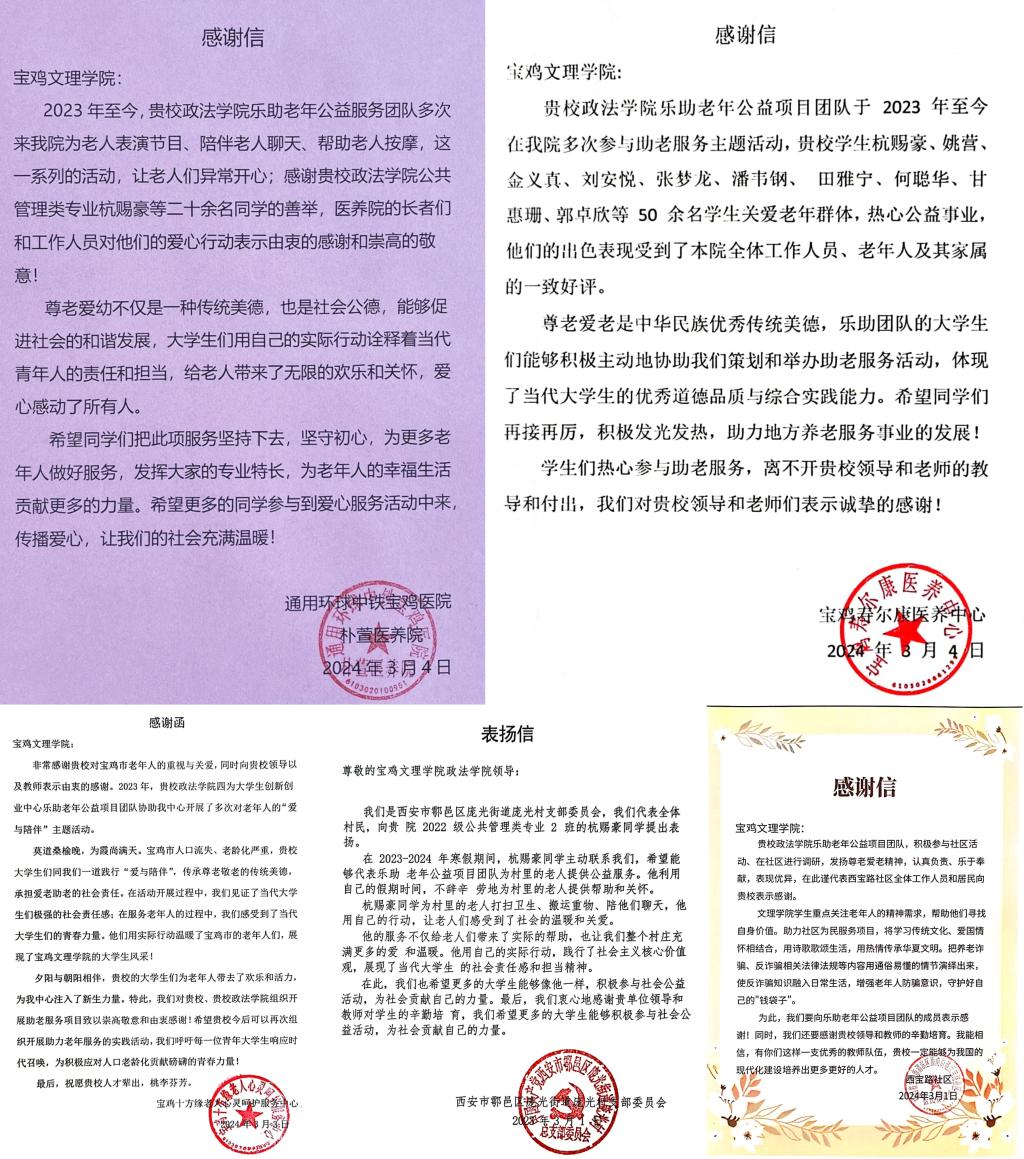 近日,万象城收到来自通用环球中铁宝鸡医院朴萱医养院、宝鸡寿尔康医养中心、宝鸡十方缘老人心灵呵护服务中心、宝鸡市西宝路社区居委会、西安市鄠邑区庞光街道庞光村的感谢信、表扬信。信中分别对万象城政法学院乐助老年公益项目团队师生表达了诚挚的谢意。