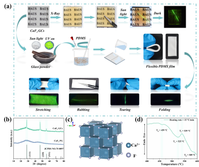 该工作系统研究了稀土掺杂氟化物基微晶玻璃作为透明刚性介质及与柔性高分子介质复合后的柔性可拉伸介质中的力致发光性能,并创新性的提出了在刚性及柔性介质中力致发光的产生机制及能量转换机理。利用透明微晶玻璃介质独特的光波导效应以及力致发光特性,实现了对力学分布的非接触和远程实时检测,为刚性介质中力致发光机理的研究和应用提出了新思路。