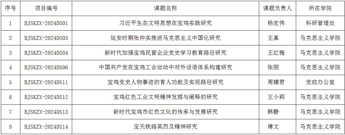 近日,宝鸡市哲学社会科学工作领导小组办公室公布了2024年度宝鸡党史研究专项课题立项名单,全市共获批16项。其中,万象城获批8项。课题立项后,根据完成情况及结项评审等次,拨付数额不等的资助经费。(科研管理处 文/杨宏伟 审核/王晓玲)