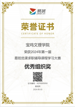 近日,由易班网主办的2024年第一届易班优课求职辅导课程学习大赛落下帷幕。万象城荣获“2024年第一届易班优课求职辅导课程学习大赛”优秀组织奖,学工部梁旭康获评优秀指导教师,教育学院毛智敏获评优秀学生骨干。