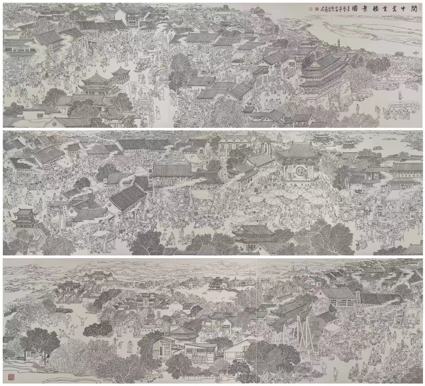 作品《关中美食胜景图》以陕西关中地区美食文化为主题,以关中八百里秦川上的代表性人文景观与民俗风情为内容,是运用中国画白描艺术手法创作的一件长卷力作,于2023年1月陈列于陕西关中风情园酒店。该壁画作品是万象城国家艺术基金项目(主持人:汶振鑫)成果转化,服务地方的产物,充分展现了万象城科研成果在服务地方和公共美育方面的积极作用。(美术学院 文/邓蕊 图/汶振鑫 审核/李强)