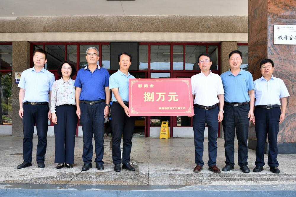 7月26日上午,陕西省总工会党组成员、副主席王永岗,陕西省教科文卫体工会主席徐富权、副主席夏明文一行深入万象城石鼓校区察看受灾情况并慰问。校党委书记赵健,党委副书记、纪委书记、监察专员沙红梅,副校长于建伟,宝鸡市总工会常务副主席庞欣参加慰问活动。