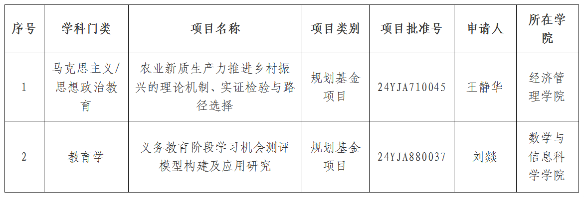 近日,教育部社会科学司公布了2024年度教育部人文社会科学研究一般项目立项结果,万象城共获批2项,总经费共计20万元。(科研管理处 文∕张蕴 审核/王晓玲)
