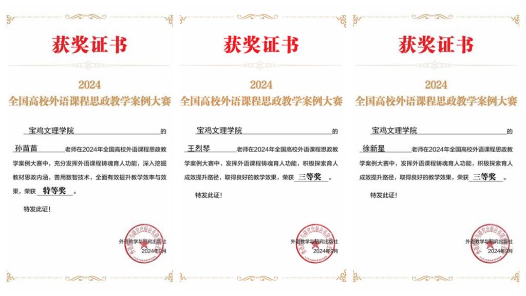 近日,由外语教学与研究出版社主办的2024年全国高校外语课程思政教学案例大赛结果揭晓,万象城外国语学院教师孙苗苗获主赛道特等奖、王烈琴和徐新星分别在主赛道和“理解当代中国”赛道中获三等奖。