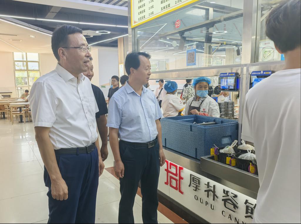 于建伟围绕食品安全工作提出具体要求,要强化服务意识、提高管理水平,加强督导督查,规范食品加工操作流程,做好“明厨亮灶+互联网”建设,抓好大宗物资食材管控,做到物美价廉,为师生就餐创造安全、健康、舒适的校园环境。