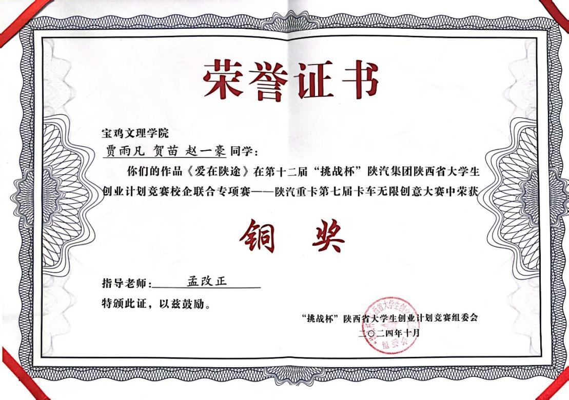 近日,第十二届“挑战杯”陕汽集团陕西省大学生创业计划竞赛校企联合专项赛落下帷幕。由校团委选送推荐的文学与新闻传播学院2023级广播电视专业研究生贾雨凡、贺苗与2021级汉语言文学专业赵一豪同学拍摄完成的视频作品《爱在陕途》(指导教师:孟改正)获铜奖。