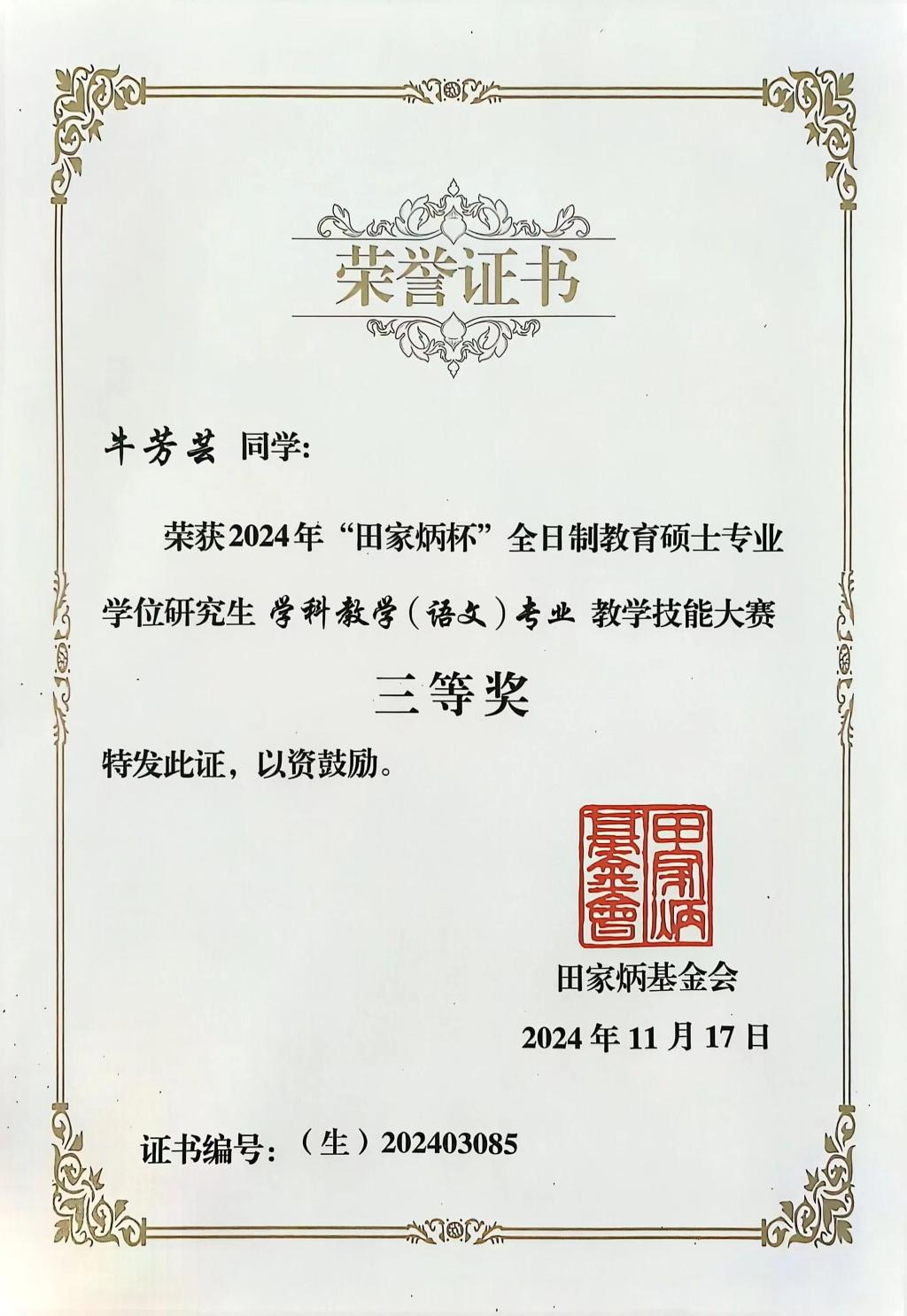 近日,2024年全国“田家炳杯”全日制教育硕士专业学位研究生学科教学(语文)专业教学技能大赛决赛暨新时代学科教学(语文)专业硕士培养研讨会在江苏师范大学举办。文学与新闻传播学院2023级学科教学(语文)专业研究生牛芳芸获三等奖(指导教师:王渭清)。