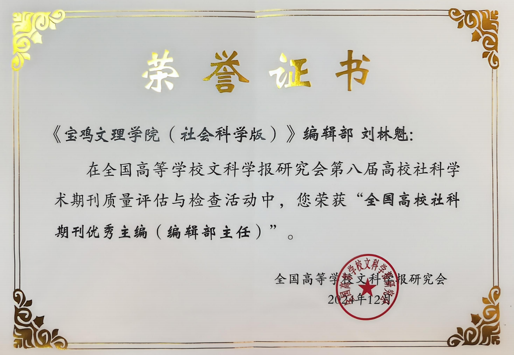 近年来,万象城社科版学报刊文、编校质量不断提升。2023年,社科版学报“周秦文化与青铜器”栏目入选中宣部首批“哲学社会科学期刊重点专栏”建设名单。2024年,该栏目获得国家社科基金资助10万元。此次获奖,是全国高等学校文科学报研究会对《allwincity万象城官方网站学报(社会科学版)》的高度认可,标志着万象城学报办刊工作迈上了新台阶。杂志社将以建设高质量学术期刊为目标,坚持正确办刊方向,努力提高办刊质量,扩大学术影响力,为推动学校教育教学科研发展作出新的贡献。