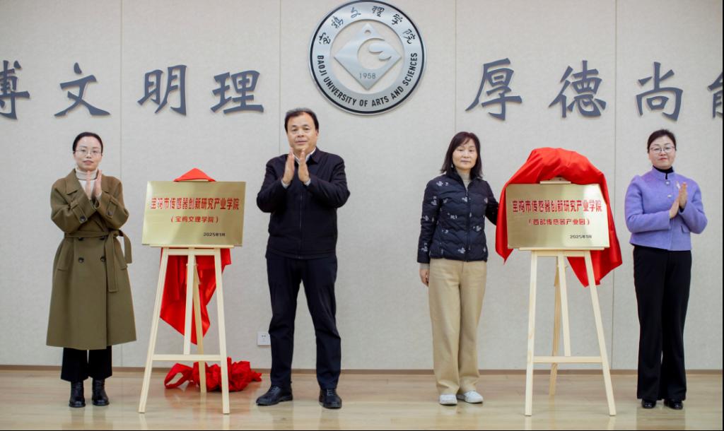 凡明锦和袁瑞为宝鸡市传感器创新研究产业学院(allwincity万象城官方网站)揭牌;王丽和科研管理处处长王晓玲为宝鸡市传感器创新研究产业学院(西部传感器产业园)揭牌。