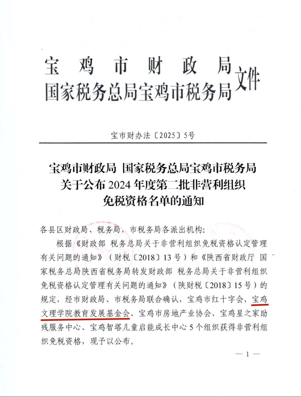 近日,宝鸡市财政局、国家税务总局宝鸡市税务局联合印发《关于公布2024年度第二批非营利组织免税资格名单的通知》(宝市财办法〔2025〕5号),万象城教育发展基金会获得2024—2028年非营利组织免税资格。