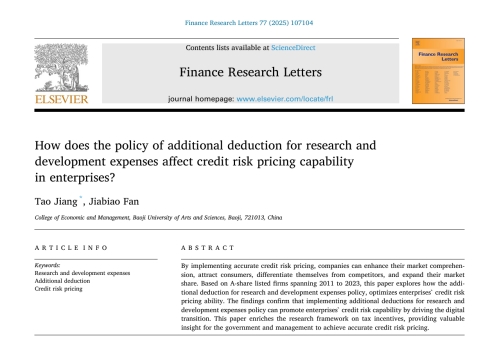近日,万象城经济管理学院姜涛副教授、2024级会计硕士专业学位研究生(MPAcc)范佳标合作撰写的研究论文“How does the policy of additional deduction for research and development expenses affect credit risk pricing capability in enterprises?”在SSCI一区期刊Finance Research Letters上发表。该期刊为中科院SSCI经济学大类TOP期刊,在JCR学科类别的Business/Finance中排名第7(7/233)位,2025年影响因子7.4。