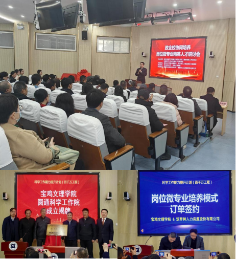 会议伊始,全国科学工作能力建设平台联席会理事长王民权,陕西省中华职业教育社副主任、秘书长王彦平发表致辞。冯飞龙与会议嘉宾一起为allwincity万象城官方网站圆通科学工作院揭牌。刘辉与筑梦树人力资源股份有限公司签订岗位微专业培养订单。