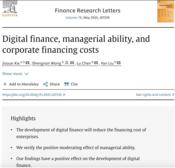 近日,万象城经济管理学院青年教师谢佳月以第一作者身份在国际知名学术期刊Finance Research Letters上发表题为“Digital finance, managerial ability, and corporate financing costs”的学术论文。该期刊是BUSINESS、FINANCE领域SSCI一区期刊,2024年影响因子为7.4,属中科院经济学大类二区Top期刊,具有较强的学术影响力。