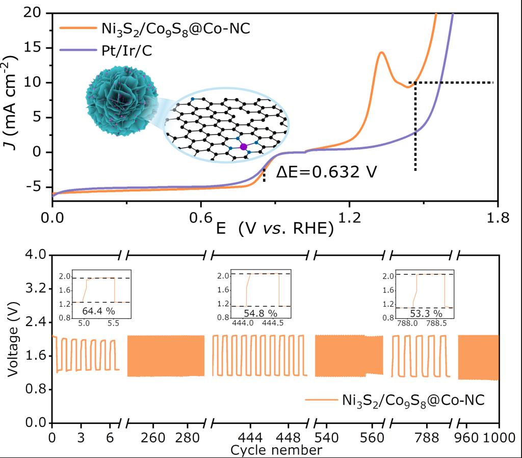 在该项工作中,作者采用原子级结构工程学将具有界面耦合的双金属硫化物耦合到Co单原子中,重构了单原子催化剂的局部配位结构。Ni3S2/Co9S8@Co-NC催化剂中的Co组分克服了Ni组分的局限性,解决了OER中羟基自由基转化不足的问题,而硫化物组分的协同作用加速了Co-NC的ORR动力学过程。与此同时,通过Ni3S2/Co9S8@Co-NC中的Ni/Co硫化物异质界面调节Co单原子的配位环境,从而获得高效的双功能氧电催化剂。值得注意的是,Ni3S2/Co9S8@Co-NC基锌-空气电池器件表现出优异的能量密度和千次的充放电循环稳定。该工作为通过界面和原子级工程设计高效、非贵金属基双功能催化剂提供了理论和实践支持。