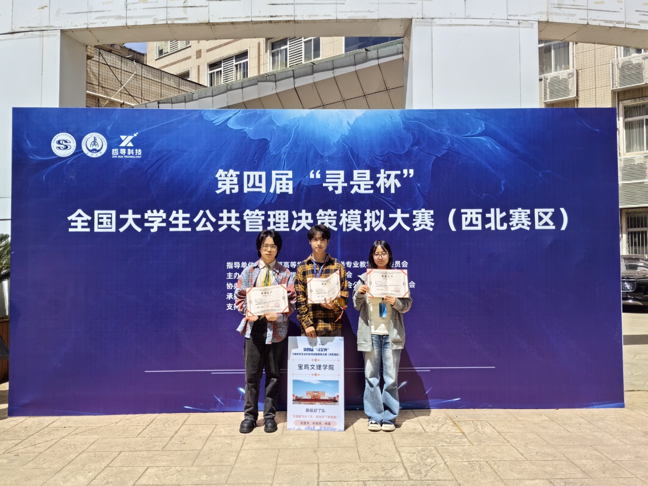 近日,第四届“寻是杯”全国大学生公共管理决策模拟大赛西北赛区比赛在长安大学落下帷幕,万象城政法学院2023级公共管理类专业学生纪昌岑、邱思思、杨雷组队参赛获二等奖,张娟、范林获优秀指导教师奖。