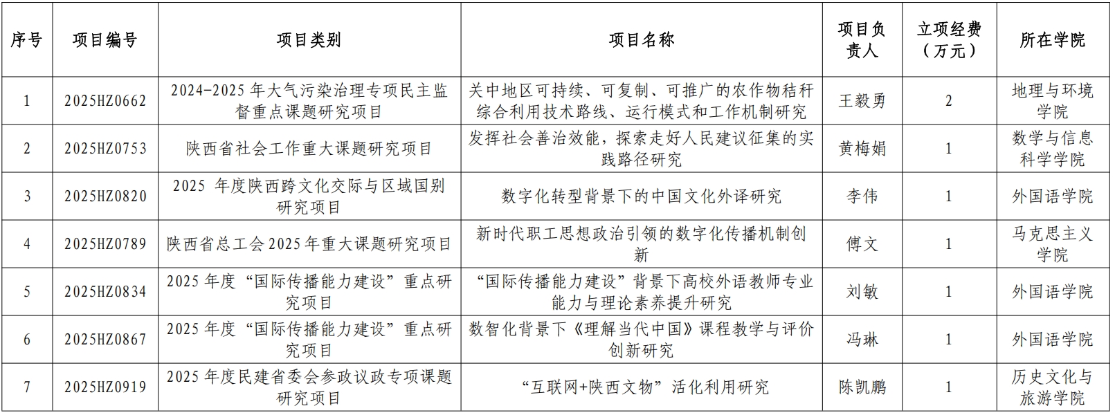 近日,陕西省社会科学界联合会陆续公布了“2024-2025年大气污染治理专项民主监督重点课题研究项目”“陕西省社会工作重大课题研究项目”“2025年度陕西跨文化交际与区域国别研究项目”“陕西省总工会2025年重大课题研究项目”“2025年度‘国际传播能力建设’重点研究项目”“2025年度民建省委会参政议政专项课题研究项目”等专项项目立项名单,万象城获批7项,资助经费共8万元。(科研管理处 文/张蕴 审核/王晓玲)
