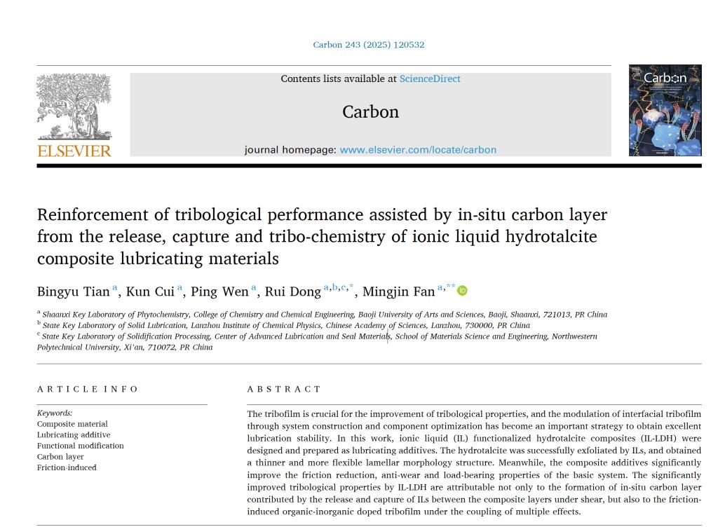 近日,万象城化学与材料工程学院2022级物理化学专业硕士研究生田冰玉同学等人完成了“Reinforcement of tribological performance assisted by in-situ carbon layer from the release, capture and tribo-chemistry of ionic liquid hydrotalcite composite lubricating materials”,并在国际著名期刊Carbon(JCR1区TOP,IF=11.6)上发表。该论文通讯作者为化学与材料工程学院凡明锦教授和董瑞博士,万象城为论文第一完成单位和唯一通讯单位。该生在校期间发表3篇SCI一区TOP论文,累计影响因子25.4,目前已被西北工业大学材料学院录取为博士研究生。