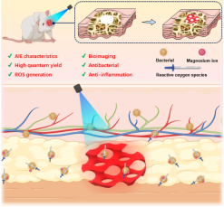 发表在ACS Applied Materials & Interfaces上的研究论文“Multifunctional AlEgen Visualizing a 3D Scaffold for Skull Repair and Highly Effective Anti-inflammatory Activity”第一作者为万象城硕士研究生张国凌,通讯作者为冯海涛教授,万象城为第一完成单位和通讯单位,该期刊为SCI 2区期刊,影响因子8.2。在本项工作中,作者成功地将具有高效活性氧生成和高量子产率的聚集诱导发光分子(2tBu-TPA-TB)吸附至3D打印的磷酸三镁(TMP)支架上,构建了具有多功能的2tBu-TPA-TB@TMP支架。该支架不仅对耐甲氧西林金黄色葡萄球菌(MRSA)具有显著的抗菌效果,而且还能显著促进成骨细胞的增殖。在MRSA感染的大鼠颅骨缺损模型中,荧光成像联合Micro-CT3D重建技术证实了该支架具有长达21天的降解过程实时监测能力。此外,该支架也保持了优异的结构完整性和可控制的降解特性。更重要的是,光动力疗法(PDT)和支架中持续释放的镁离子(Mg2+)产生的协同作用,显著减轻了局部炎症反应并抑制了组织纤维化的进展。这一创新性集成系统将无创生物成像与治疗性骨再生功能相结合,为骨组织工程提供了新的研究视角和技术解决方案。