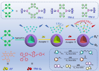发表在Chinese Chemical Letters上的研究论文“Sequential FRET system based on macrocyclic AIEgens for versatile photocatalysis”第一作者为万象城研究生刘孟鑫,通讯作者为苏小龙副教授和冯海涛教授,万象城为第一完成单位和通讯单位,该期刊为中科院一区Top期刊,影响因子8.9。在本项工作中,作者设计合成了两种不同尺寸空腔且具有聚集诱导发光(AIE)特性的四苯基乙烯(TPE)大环化合物(TPE-1和TPE-2)以及对照结构的线性分子TPE-3。利用TPE大环的空腔结构,通过主客体作用构筑水相光捕获体系并催化有机反应。结果表明,较大空腔的大环化合物TPE-1具有更高的荧光量子产率,加之供体/受体之间更好的尺寸匹配、较好的光谱重叠面积以及逐级递进的主客体作用和AIE效应,实现了供体分子TPE-1的能量能够高效且连续的传递,能量传递效率高达95%。更重要的是,该体系展现出优异的催化性能,成功实现了具有广泛底物兼容性的光催化苄胺氧化偶联反应、N-苯基四氢异喹啉与吲哚的交叉脱氢偶联(CDC)反应以及苯甲硫醚氧化反应。AIE特性大环空腔结构为开发新型仿生光催化系统提供了创新性的设计策略。