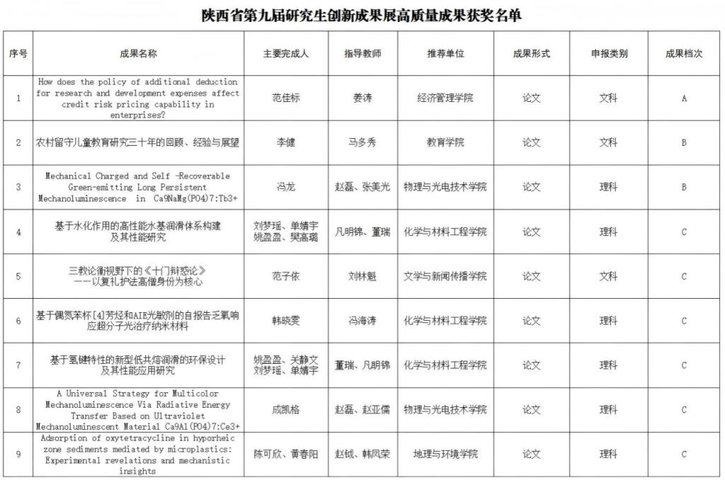 近日,陕西省教育厅、陕西省学位委员会公布了陕西省第九届研究生创新成果展评审结果。万象城研究生凭借突出的科研创新能力与优秀的成果质量,获得A档成果1项、B档成果2项、C档成果6项,共计9项。此外,研究生工作部杨博文同志荣获“表现突出个人”荣誉称号。