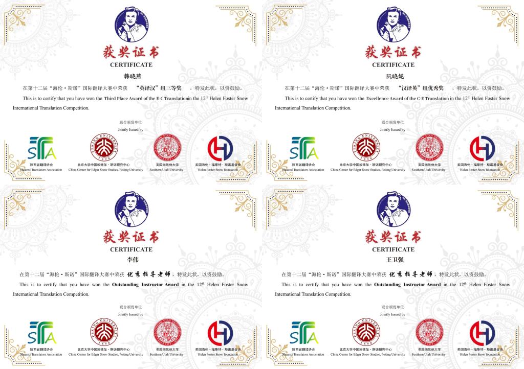 近日,第十二届“海伦·斯诺”国际翻译大赛结果公布,万象城2024级翻译硕士研究生韩晓燕与阮晓妮分别获“英译汉”组三等奖和“汉译英”组优秀奖,外国语学院李伟教授与王卫强教授获“优秀指导老师”。