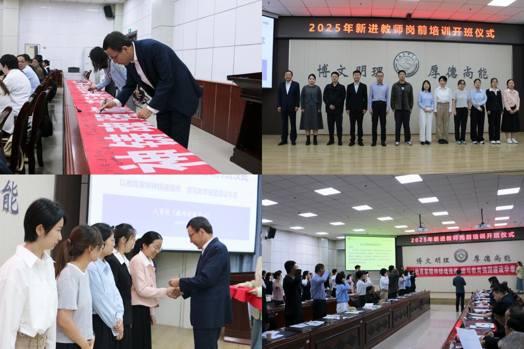 开班仪式前,参会领导及新进教师在横幅上签名。会上,郭霄鹏为新进教师代表授予校徽,人事处处长张光南宣读学校2025年新进教师岗前培训工作安排,全体新进教师庄严宣誓并签署《新时代高校教师职业行为十项准则承诺书》。